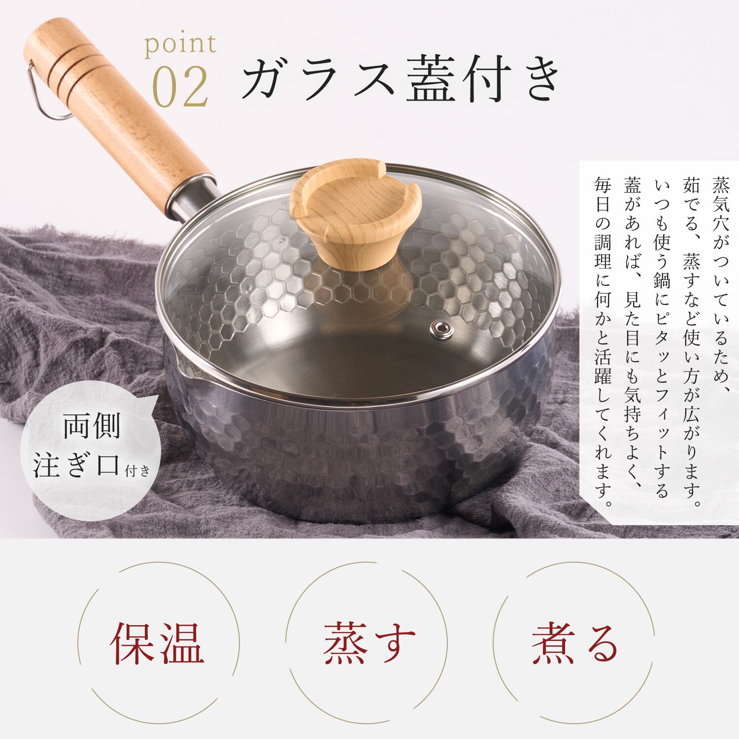 ・蒸気穴があるガラス蓋付きなので大変お得!