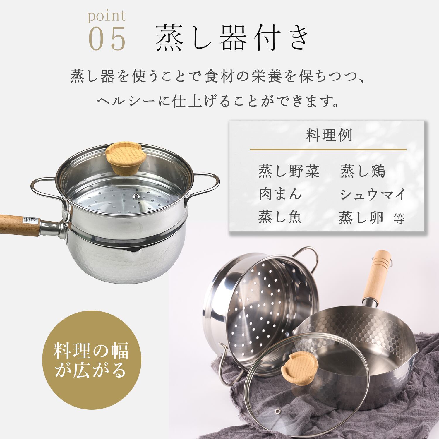 蓋を使って茹でる、蒸すなどの使い方もできます